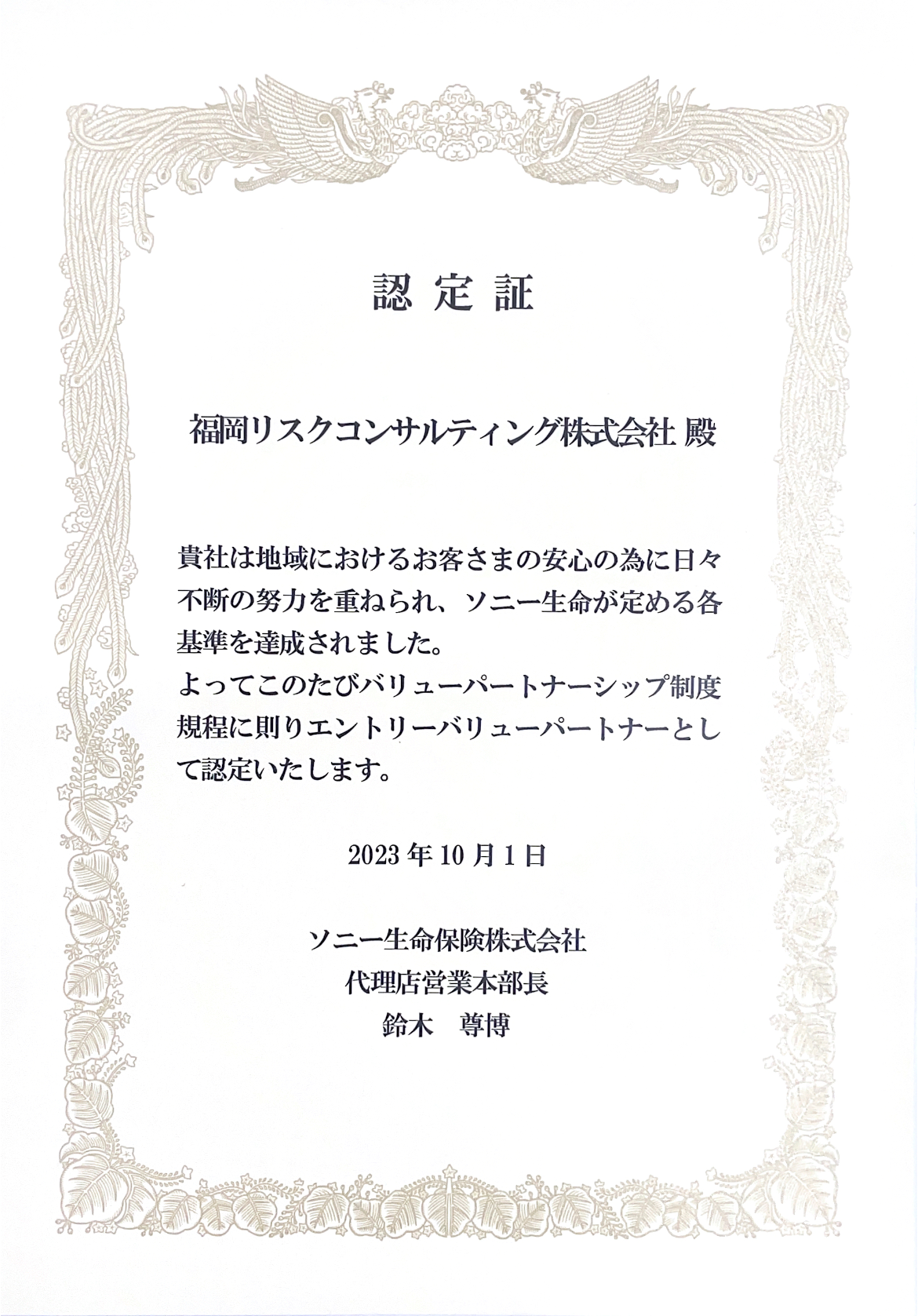 福岡リスクコンサルティング株式会社は2023年10月にソニー生命保険会社による代理店評価制度において
