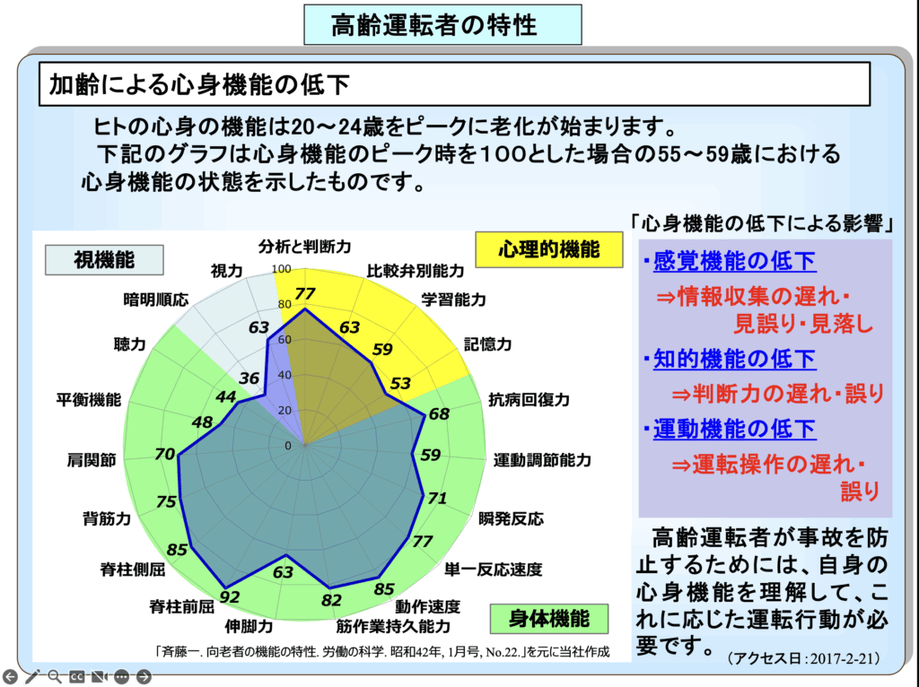 歩行者、道路横断中(右→左)との重大事故が多く発生していること、高齢運転者の事故とその対策などについてお話ししています。